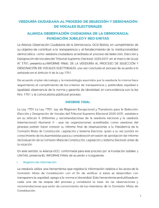 La Alianza Observación Ciudadana de la Democracia, OCD Bolivia, en cumplimiento de su objetivo de contribuir a la transparencia y al fortalecimiento de la institucionalidad democrática, como veeduría ciudadana acreditada al proceso de Selección, Elección y Designación de Vocales del Tribunal Supremo Electoral 2025 -2031 en el marco de la Ley N° 1701, presenta su INFORME FINAL DE LA VEEDURÍA AL PROCESO DE SELECCIÓN Y DESIGNACIÓN DE VOCALES ELECTORALES, una vez concluido el proceso de acuerdo a lo señalado en el Artículo 9 de la Ley 1701.