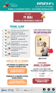Presentamos en este reporte, las fechas clave, el reporte de desinformación con Bolivia Verifica y dos análisis de la semana: Propuestas de los candidatos para políticas sociales y seguimiento a sus redes sociales.